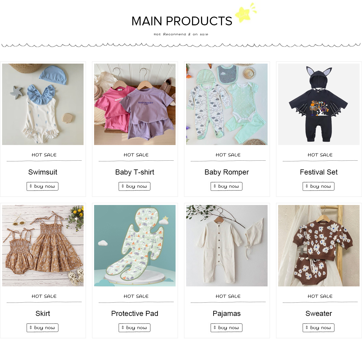 Productos principales:Ropa, mameluco de bebé, medias de baile, ropa de niña, ropa de niño